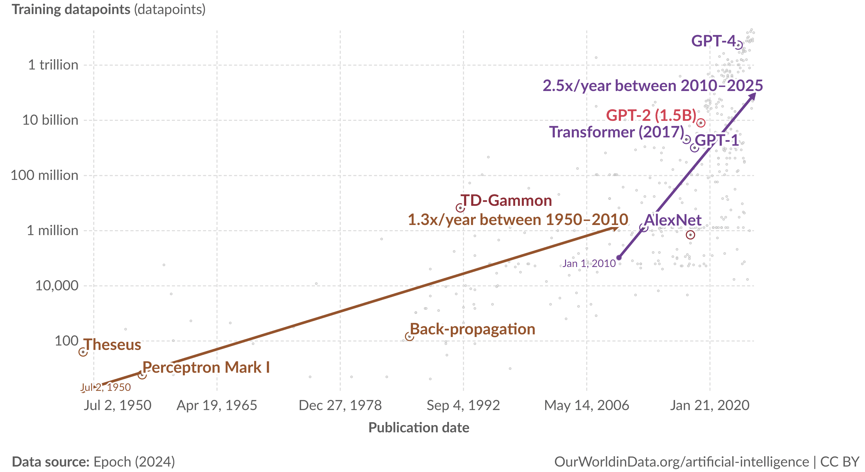 Modern AI models rely on vast amounts of training data. Feeding the model with larger and more diverse data improves its generalization, learning capacity, and enables it to make better predictions. The volume of data used for training has grown exponentially since 2010, doubling approximately every nine to ten months. It’s even faster for LLMs, tripling in size each year. For instance, GPT-2 was trained on nearly 4 billion tokens, while GPT-4 was trained on nearly 13 trillion tokens.