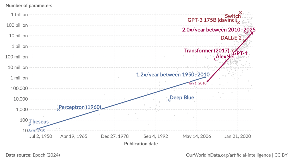 In AI, a parameter is a value within a model that gets adjusted during training to help the model make better predictions. Think of them as settings or controls that AI fine-tunes to learn patterns in the data. The number of parameters in AI models has skyrocketed, doubling every year since 2010. For example, GPT-3 has 175 billion parameters, while GPT-4 is believed to contain around 1 trillion parameters. The increase in parameters allows AI models to capture more complicated patterns and relationships within the data, making them more powerful and capable.